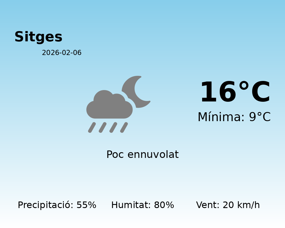 Avui a Sitges, es preveu un dia relativament fresc amb un rang de temperatures que anirà des dels 9°C de mínima fins als 16°C de màxima. A causa de les condicions meteorològiques, es recomana als habitants que es preparin per a un dia humit i ventós.