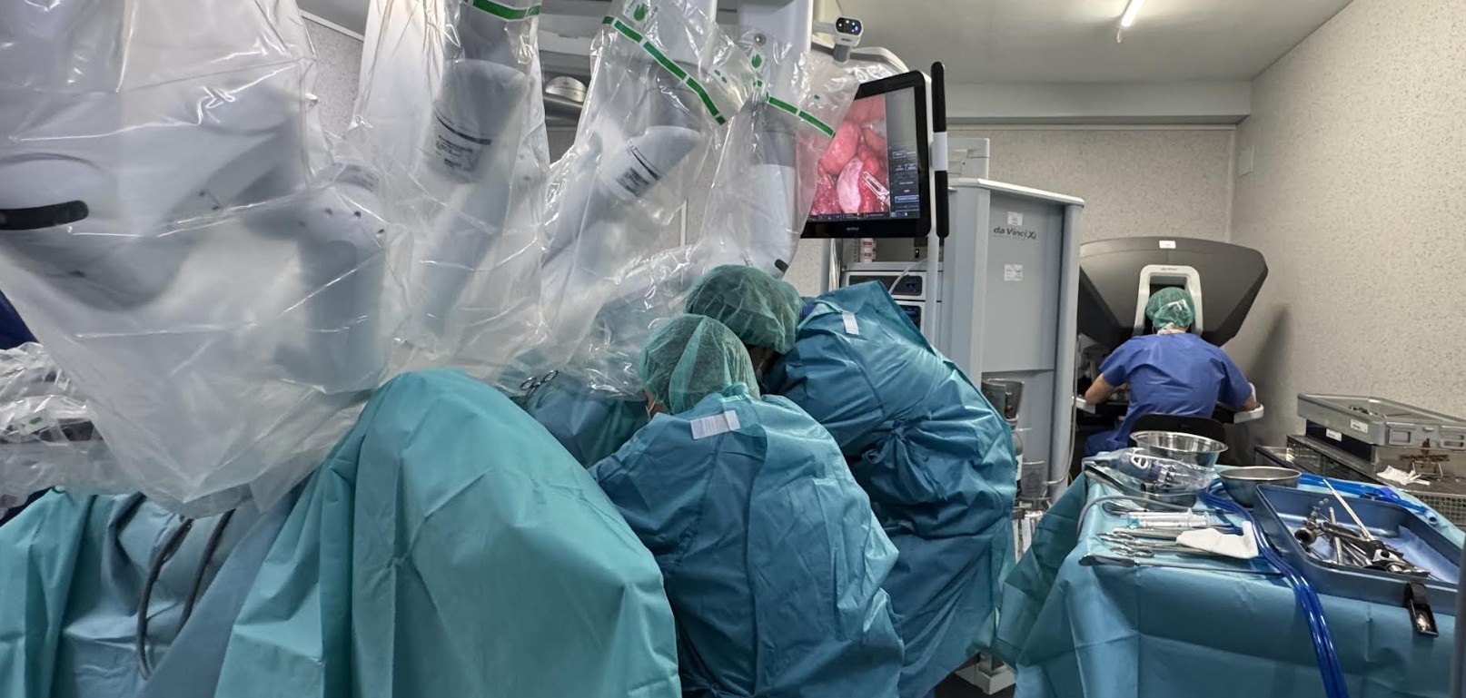 Els doctors Jaime Siegrist, Patricia Alonso i Carolina Galocha realitzant una intervenció complexa mitjançant cirurgia amb el robot Da Vinci Xi.