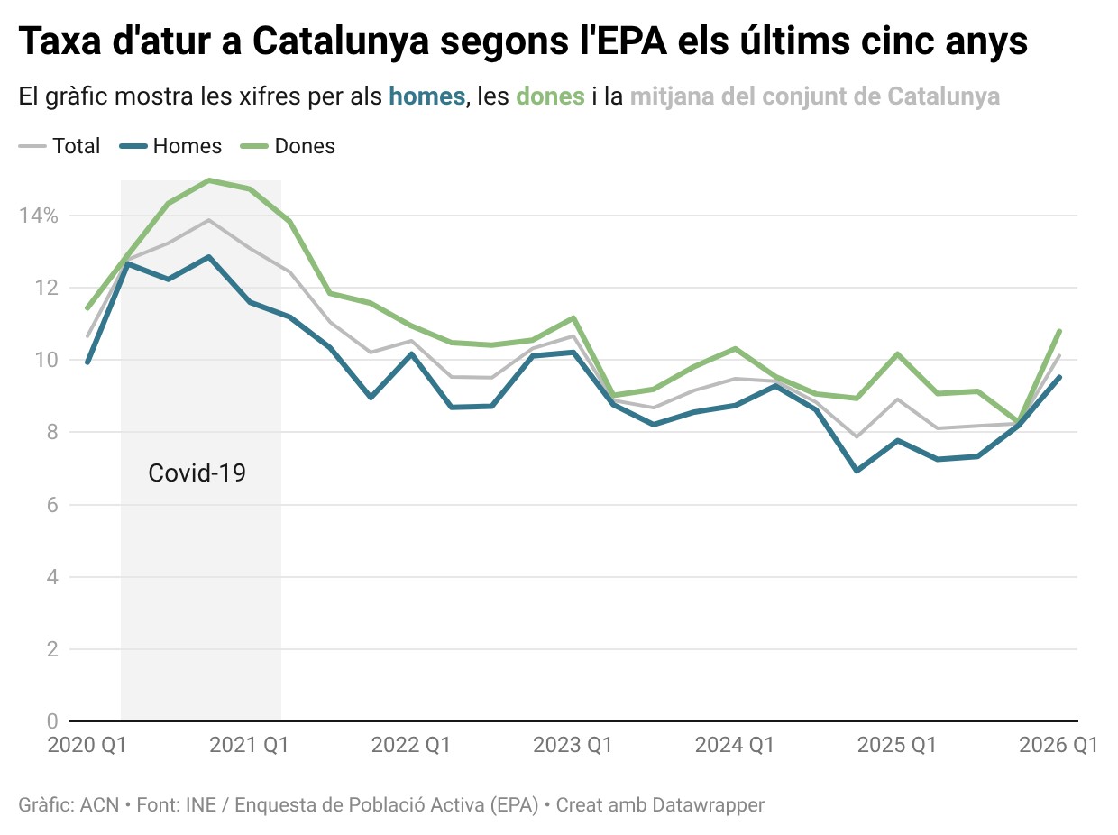 ACN Barcelona – Catalunya supera el 10% d’aturats per primer cop en tres anys i assoleix un total de 435.600 persones sense feina, segons l’Enquesta de Població Activa (EPA) de l’Institut Nacional d’Estadística (INE). En total, Catalunya ha començat l’any un 24% més d’aturats que el trimestre anterior i un 15,7% més que l’any passat. Són d’increments que no es veien des del 2009, en el primer cas, i des del 2021 en el segon. La taxa d’atur ha crescut 1,88 punts amb relació al trimestre anterior i s’ha tornat a situar en el doble dígit després d’onze trimestres. L’indicador se situa 1,21 punts per sobre de la dada de fa un any (8,91%).