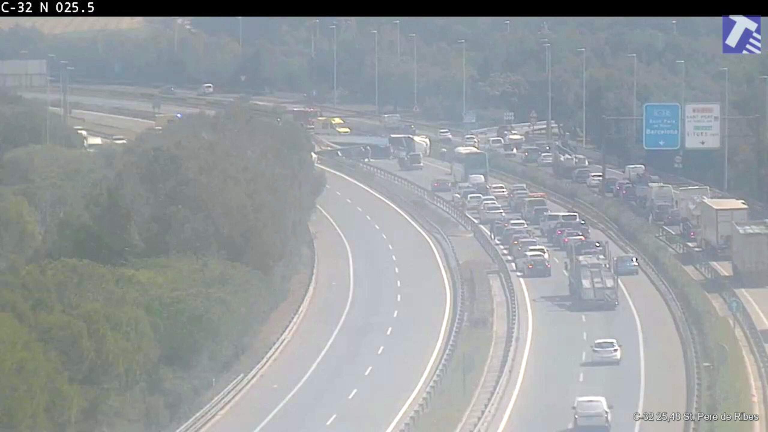ACN Barcelona – L’autopista C-32 ha quedat tallada aquest dijous a partir de les 13.48 hores en els dos sentits de la marxa a l’altura del quilòmetre 26,2, a Sant Pere de Ribes (Garraf), per un accident. Un camió ha quedat bolcat en sentit Barcelona i la seva càrrega ha caigut en sentit Tarragona. El Servei Català de Trànsit ha desviat la circulació per les calçades laterals. Els Bombers de la Generalitat han mobilitzat set dotacions. Protecció Civil ha activat la fase d’alerta del pla Transcat perquè el camió ha vessat uns 7.000 litres de líquid corrosiu orgànic a la calçada i el medi natural.