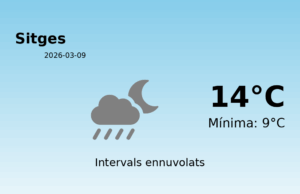 Avui, 9 de març de 2026, Sitges experimentarà un dia plenament hivernal amb condicions meteorològiques marcades per una notable humitat i pluges persistents. La temperatura màxima prevista ascendirà a només 14 graus Celsius, mentre que la mínima es situarà al voltant dels 9 graus.