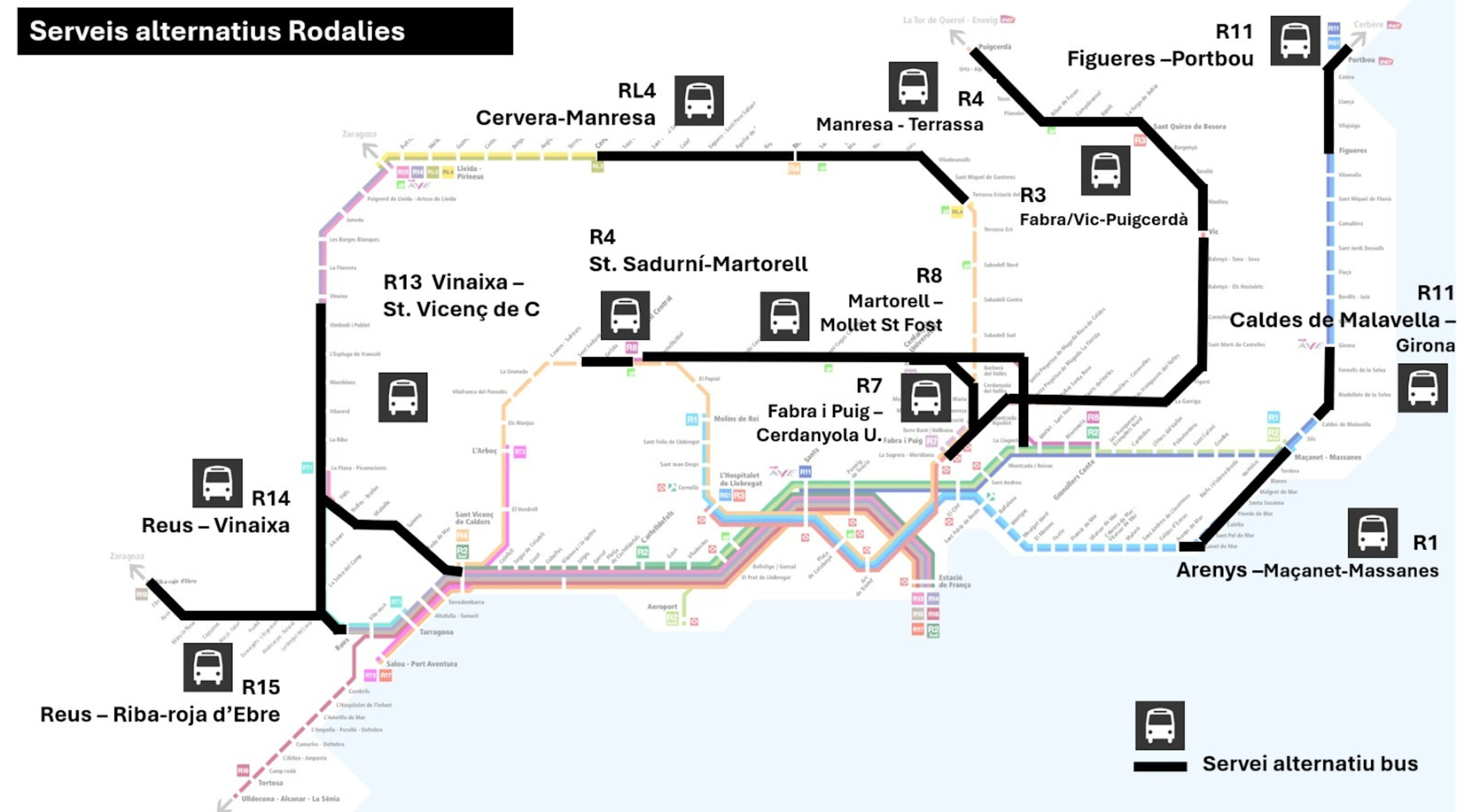 A l’R4, entre Sant Vicenç de Calders i Sant Sadurní d’Anoia es el servei està previst en tren, entre Sant Sadurní i Martorell Central, per carretera, entre Martorell Central i Terrassa-Estació del Nord servei en tren i entre Terrassa-Estació del Nord i Manresa, servei alternatiu per carretera.